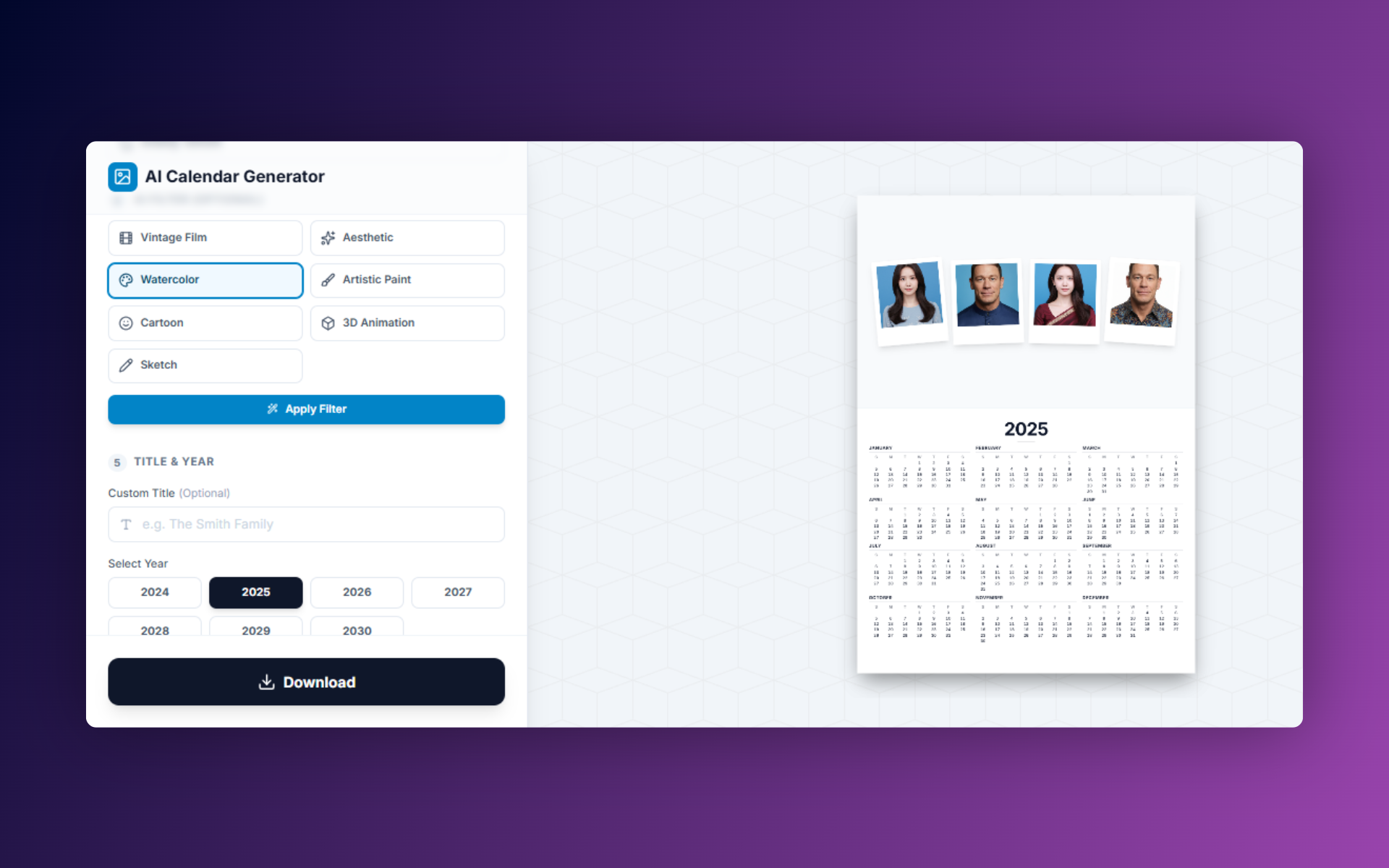 App AI Photo Calendar ini ialah satu app online percuma untuk anda buat satu poster kalendar dengan mudah. Dengan app ini, semuanya siap dalam beberapa saat. Tak perlu prompt, tak perlu edit sendiri. Hanya upload gambar dan pilih setting sahaja.