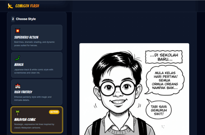 Pengguna boleh memilih pelbagai gaya kartun seperti superhero action, manga (japanese), high fantasy dan juga Malaysia comic.